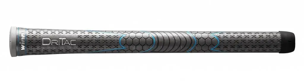 This ladies’ or undersize Dri-Tac grip has a cushioned, comfortable feel and remains tacky in all weather conditions. It has a light gray color with striking blue paintlines and a stylish grey end cap.